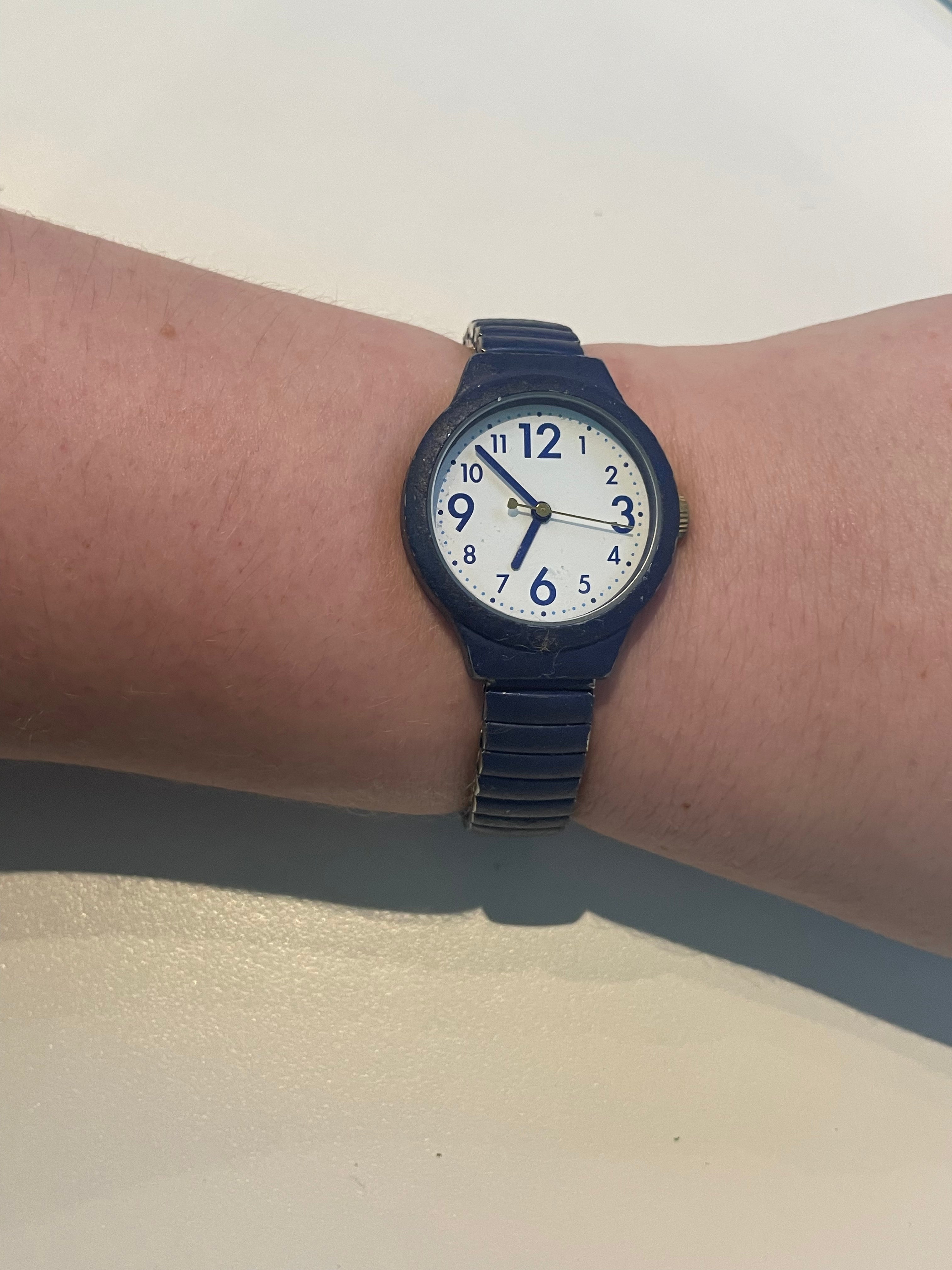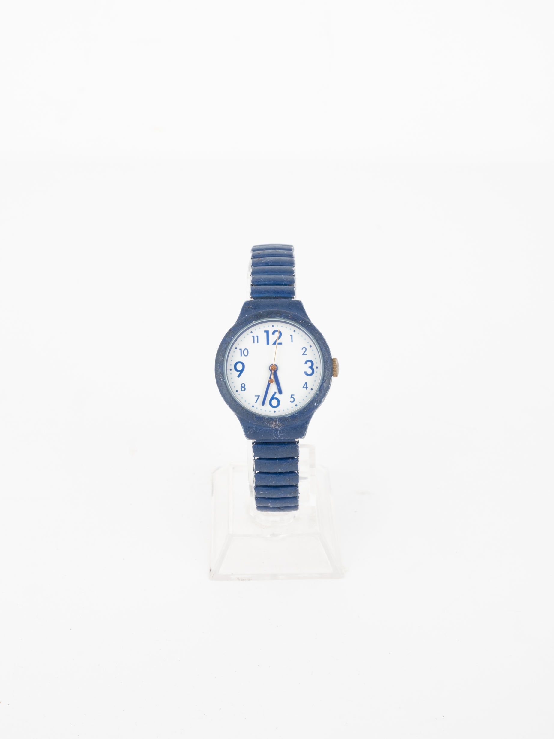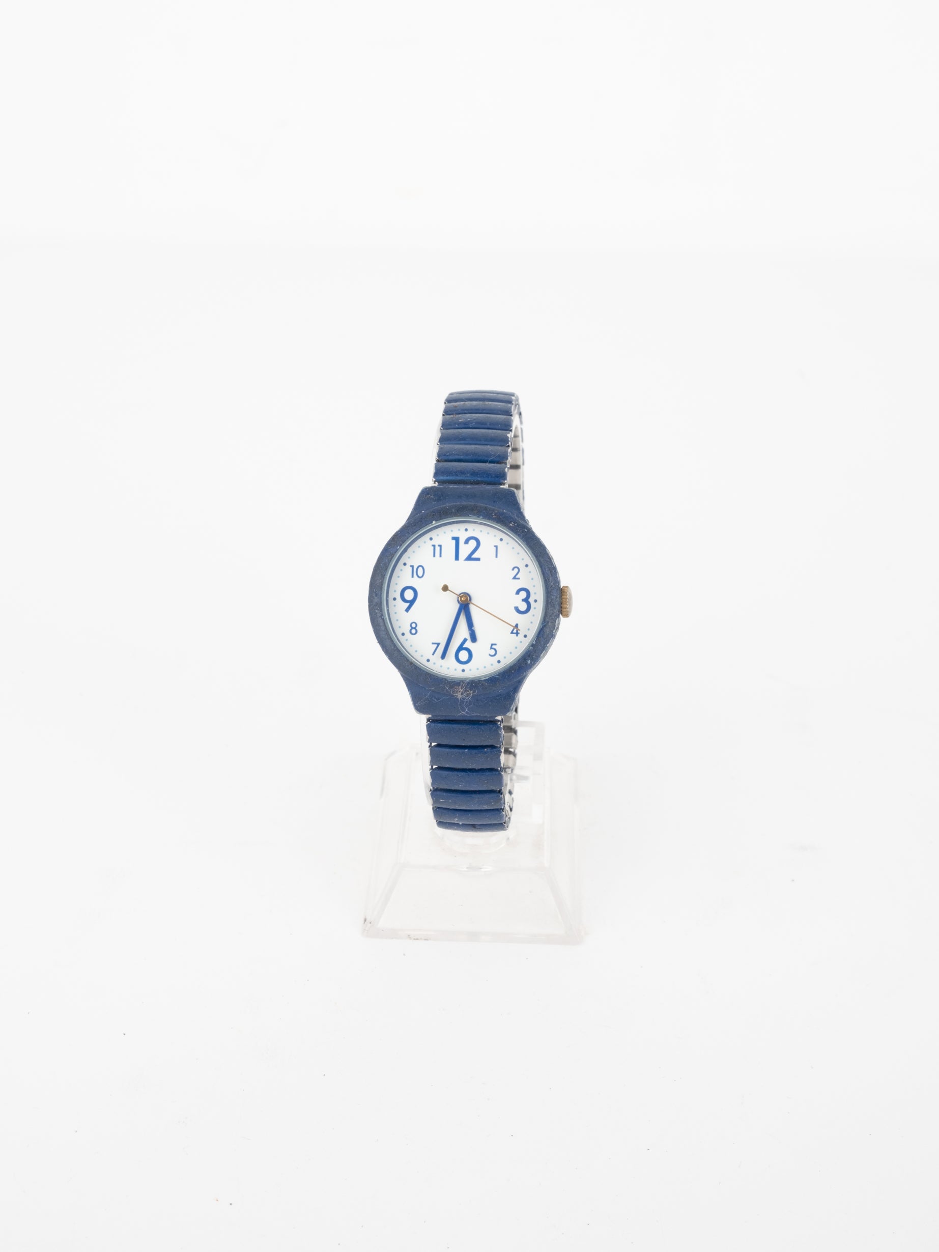 שעון ספורטיבי בצבע כחול רויל בעל פני שעון בצורה עגולה עם רקע לבן ומחוגים. שעון זה נלבש על היד ומתרחב בהתאם למידה.