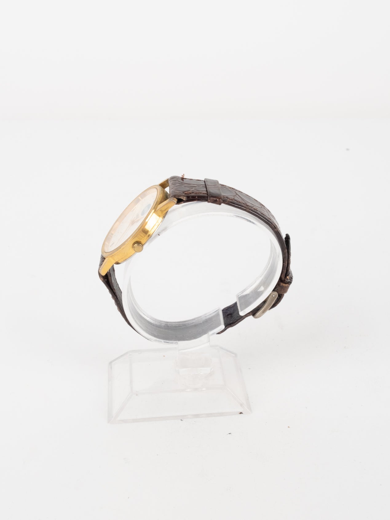 שעון קלאסי בעל פני שעון בצורה עגולה עם מסגרת מוזהבת רקע לבן ומחוגים. שעון זה נסגר באמצעות רצועות העשויות מעור בצבע חום שניתן לכוון.