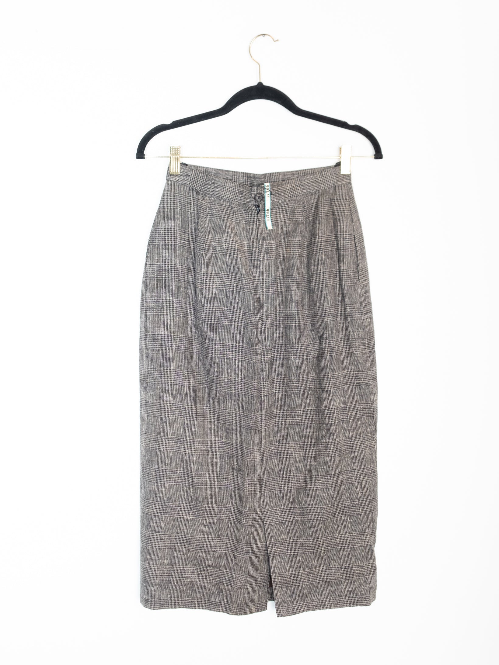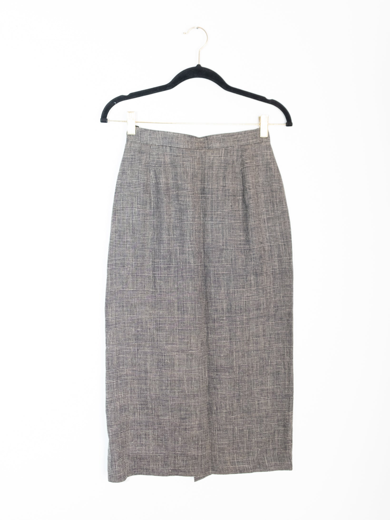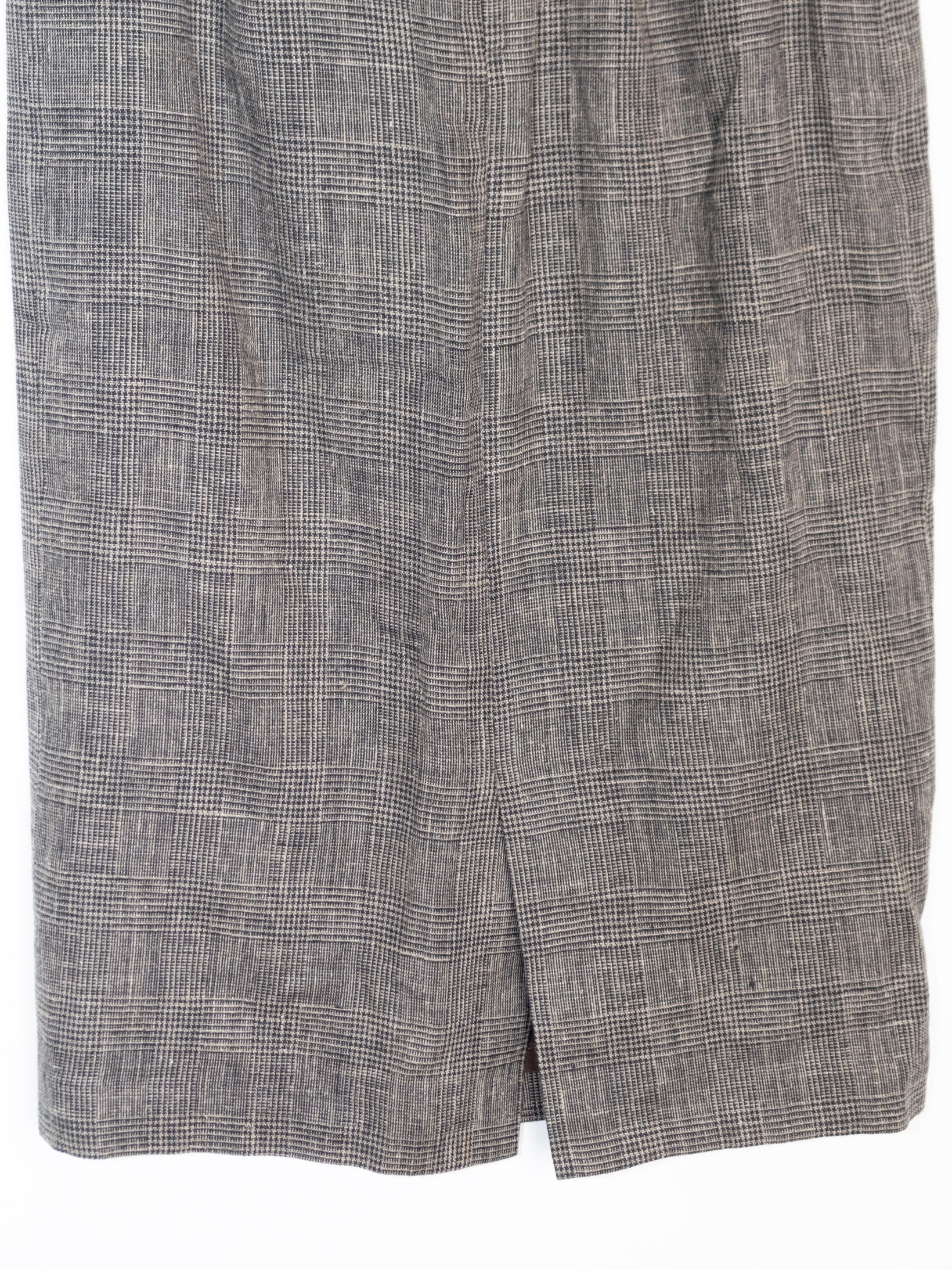 חצאית באורך מידי עשויה מבד זהה כמו הג׳קט הנסגרת באמצעות רוכסן וכפתור שחור.