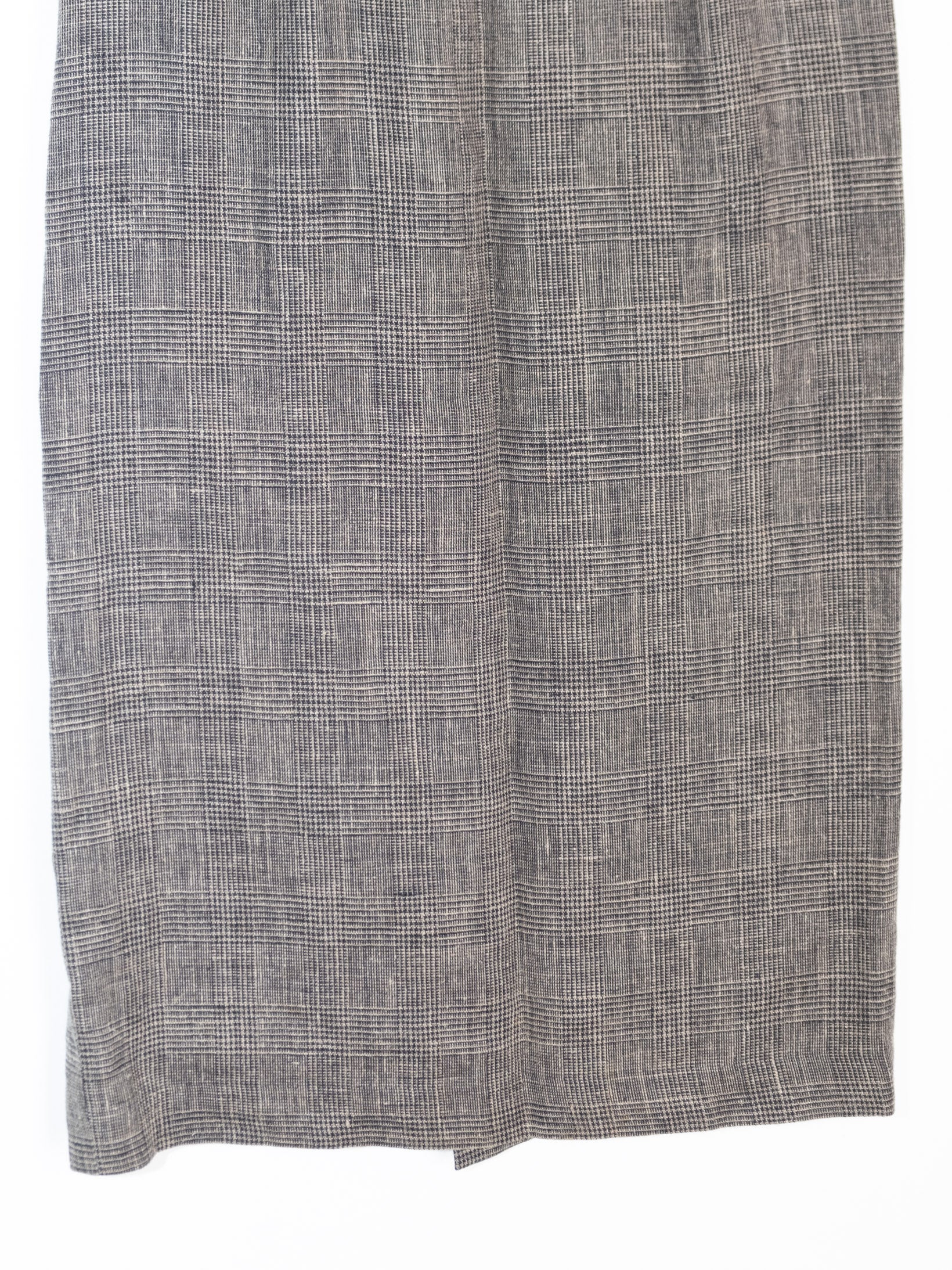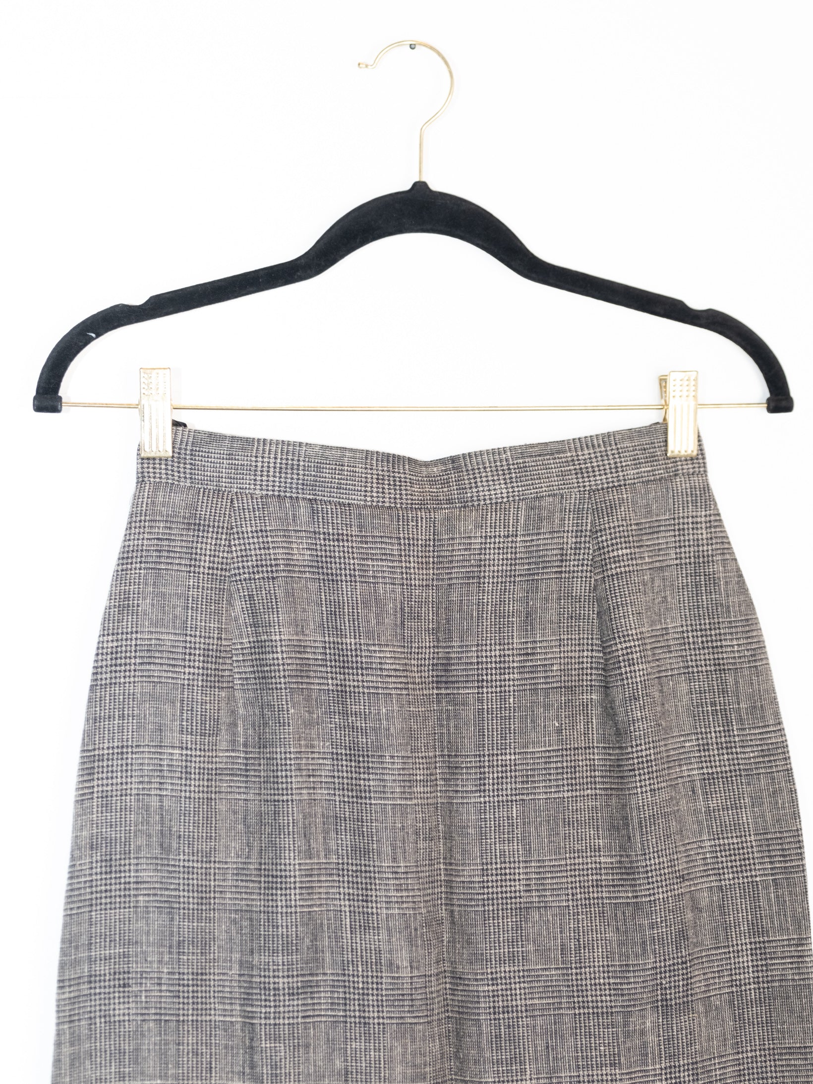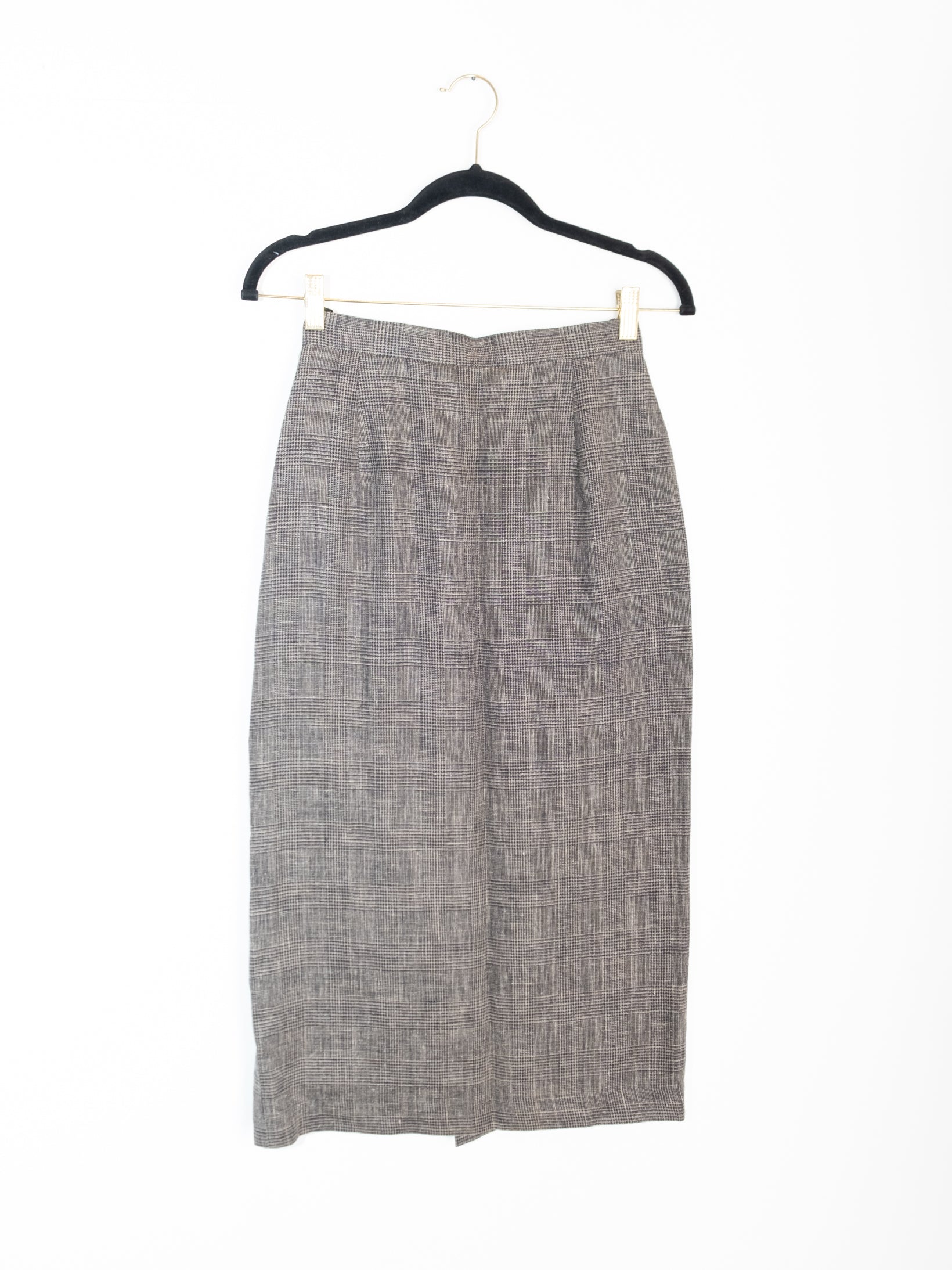חצאית באורך מידי עשויה מבד זהה כמו הג׳קט הנסגרת באמצעות רוכסן וכפתור שחור.