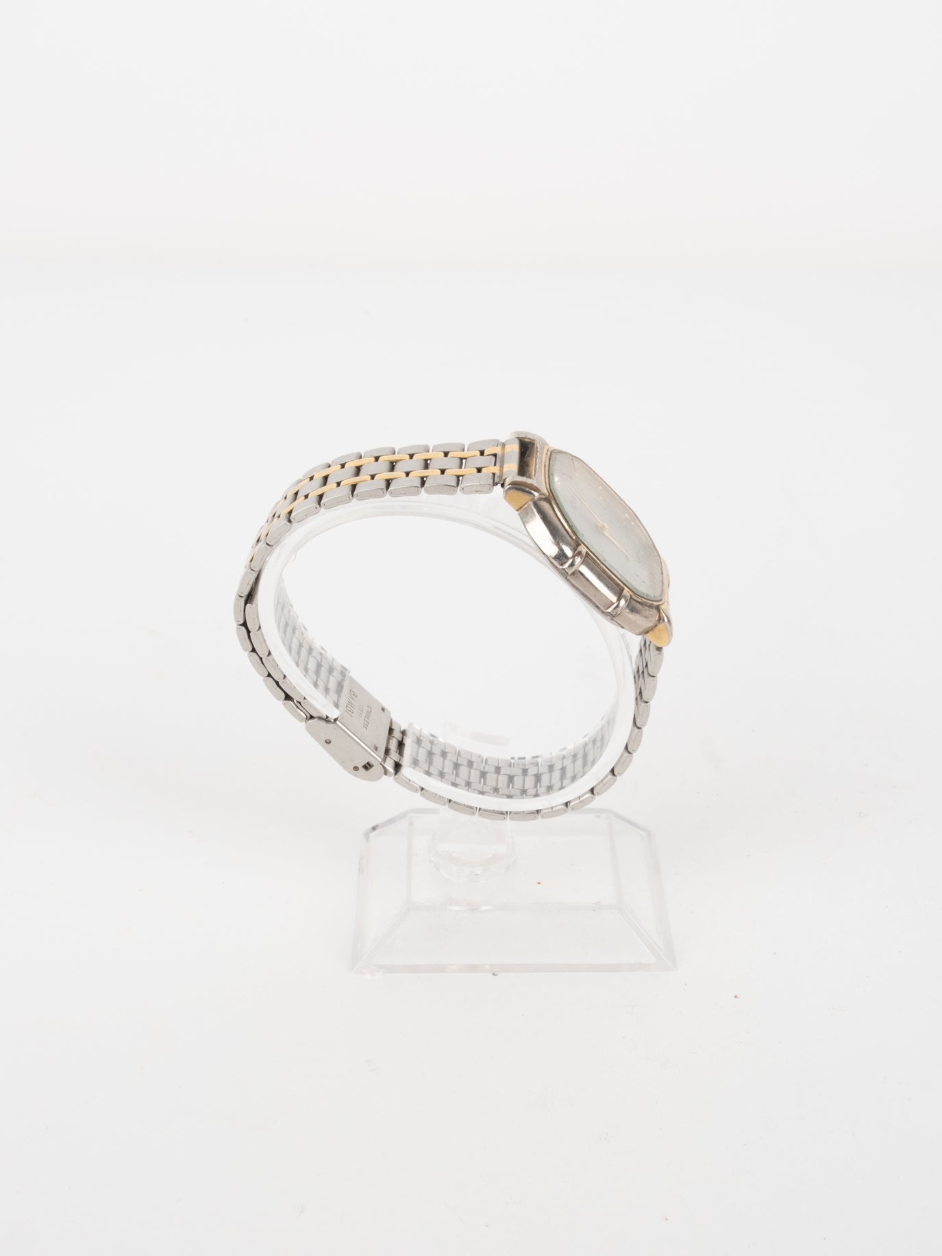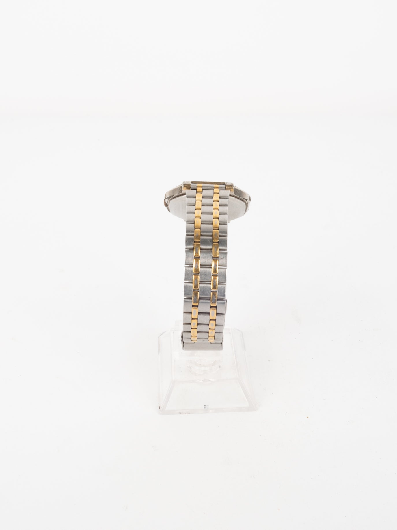 שעון מסיבי בצבע כסוף המשולב עם זהב, בעל פני שעון בצורה עגולה עם רקע אפור ומחוגים. שעון זה נסגר באמצעות סוגר ממותג.