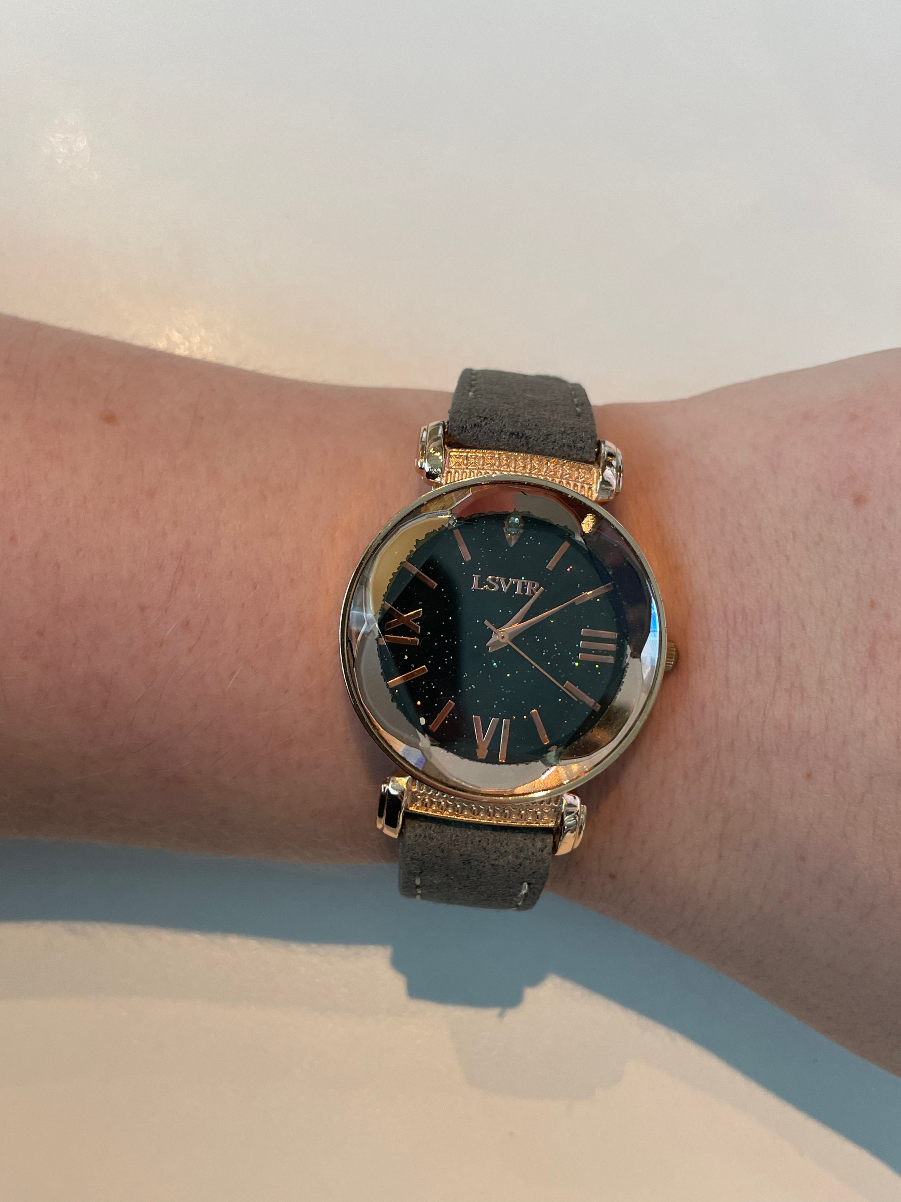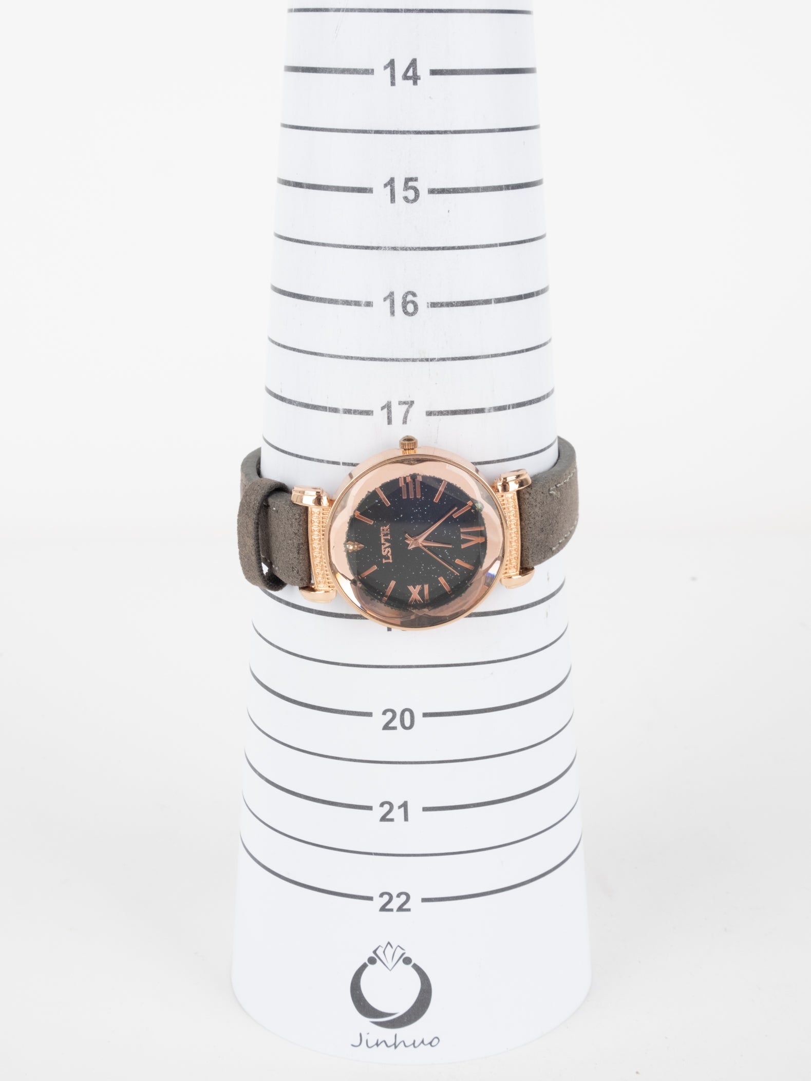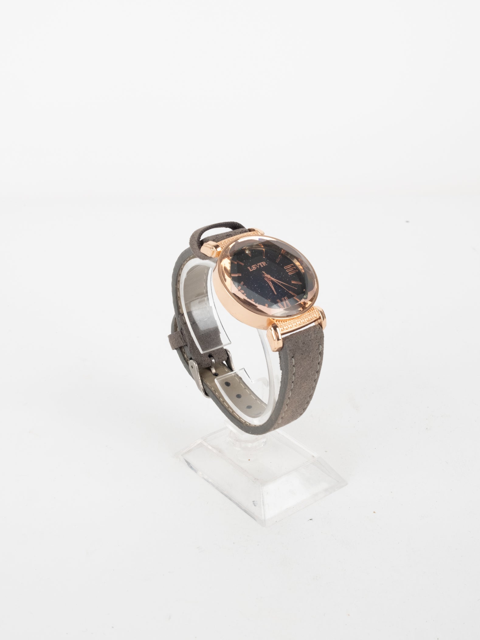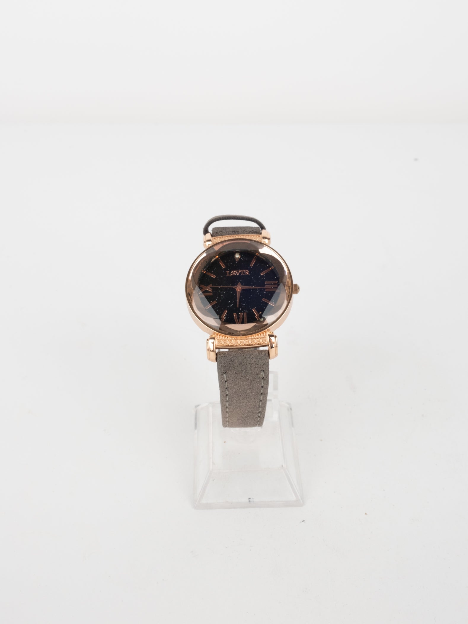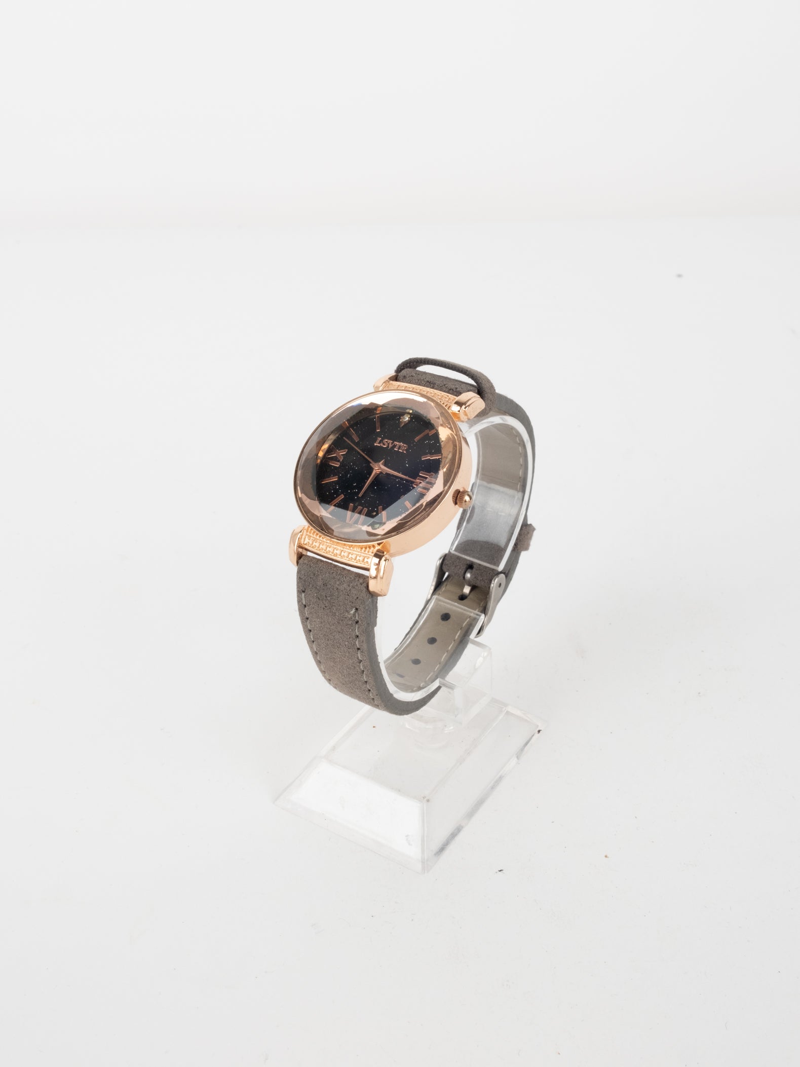 שעון מהמם בעל פני שעון בצורה עגולה עם מסגרת בצבע זהב ורוד עם רקע שחור מצופה בנצנצים ומחוגים. שעון זה נסגר באמצעות רצועות העשויות מקטיפה בצבע אפור שניתן לכוון.