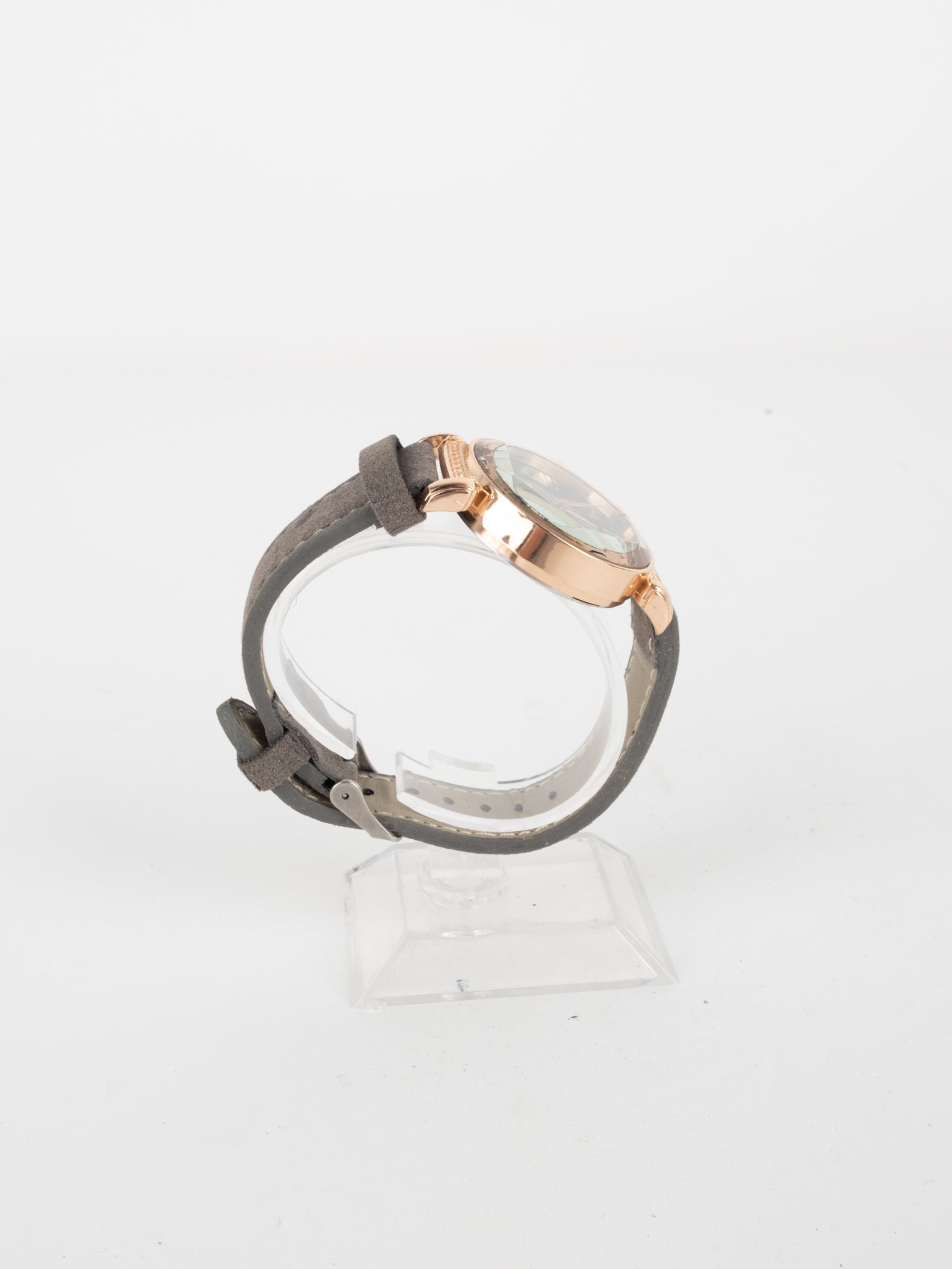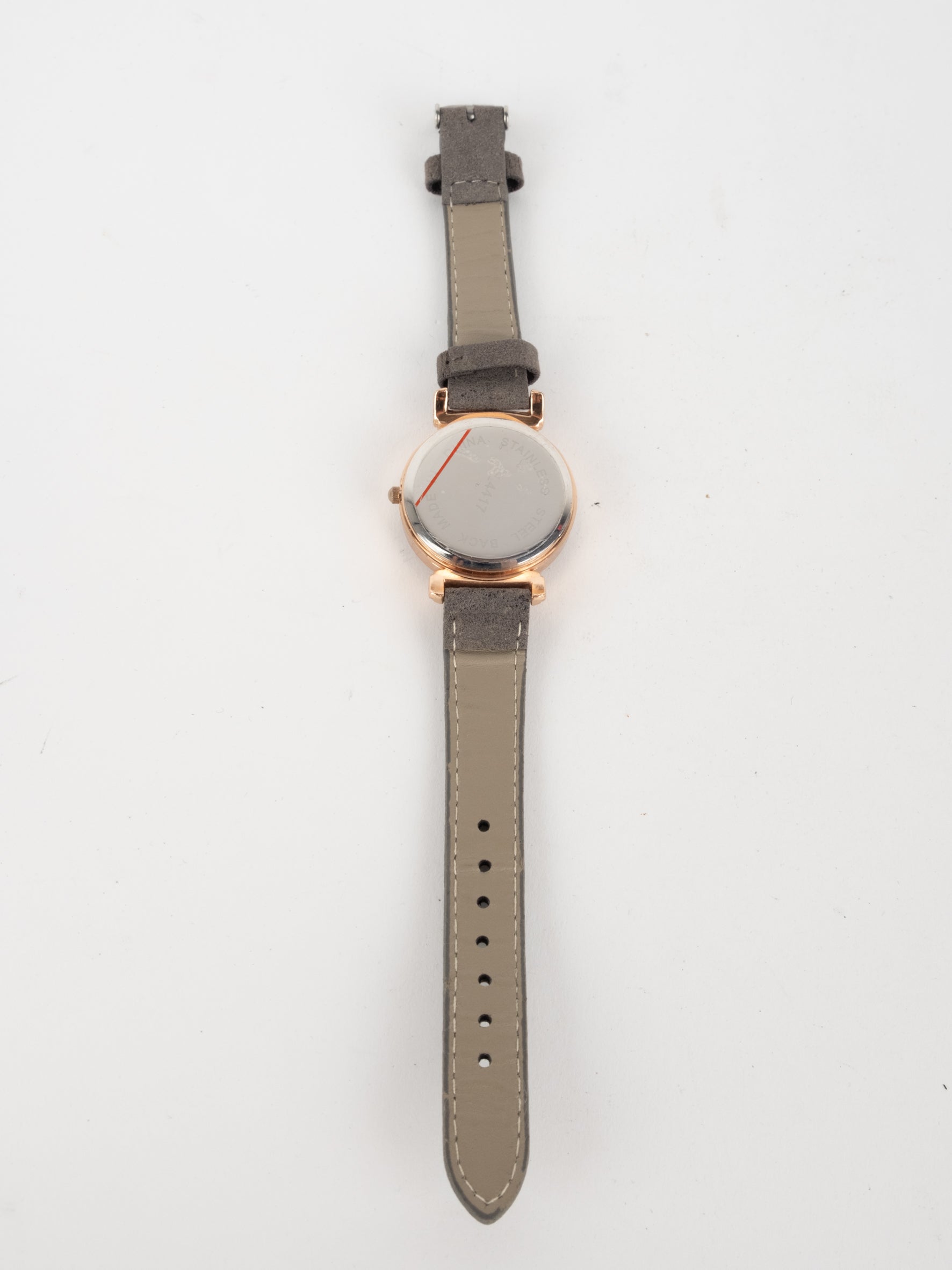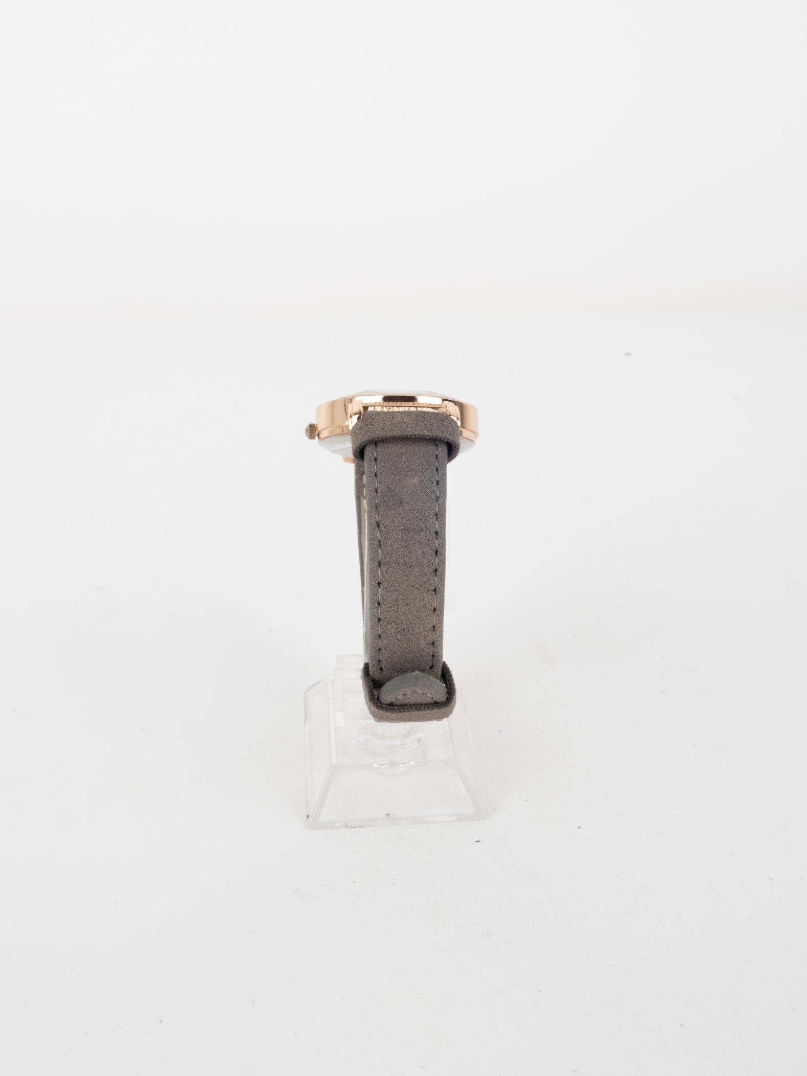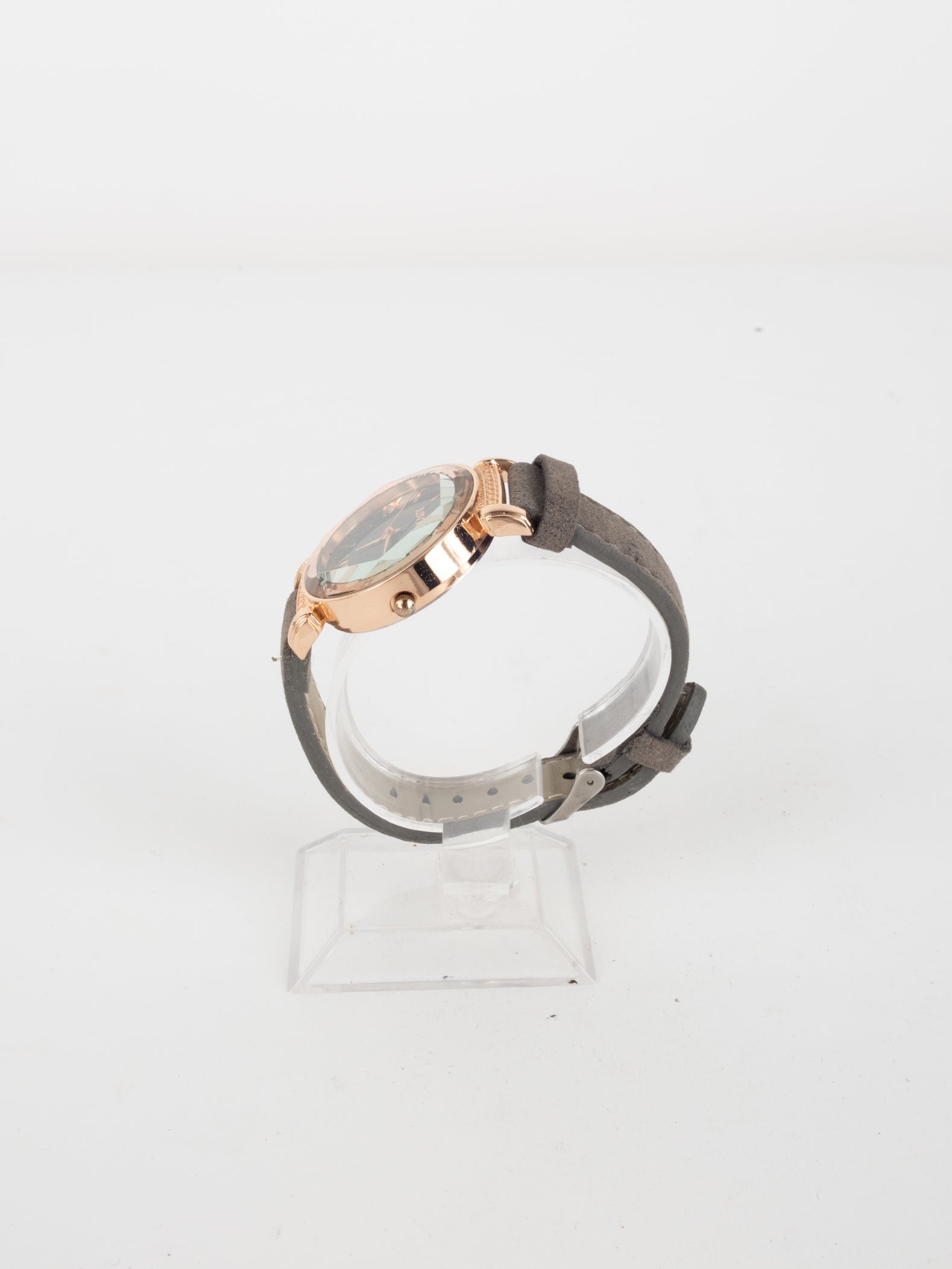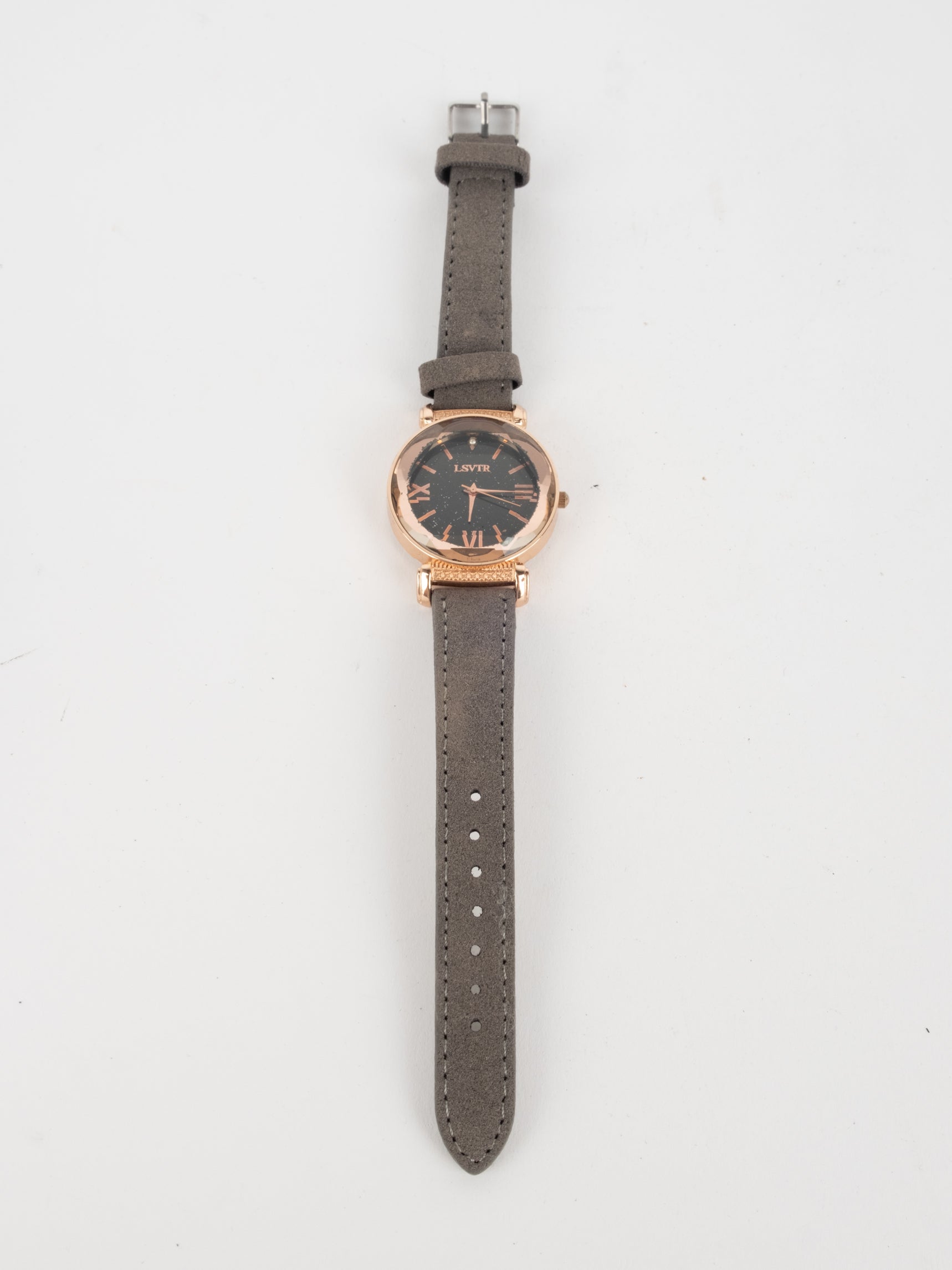 שעון מהמם בעל פני שעון בצורה עגולה עם מסגרת בצבע זהב ורוד עם רקע שחור מצופה בנצנצים ומחוגים. שעון זה נסגר באמצעות רצועות העשויות מקטיפה בצבע אפור שניתן לכוון.