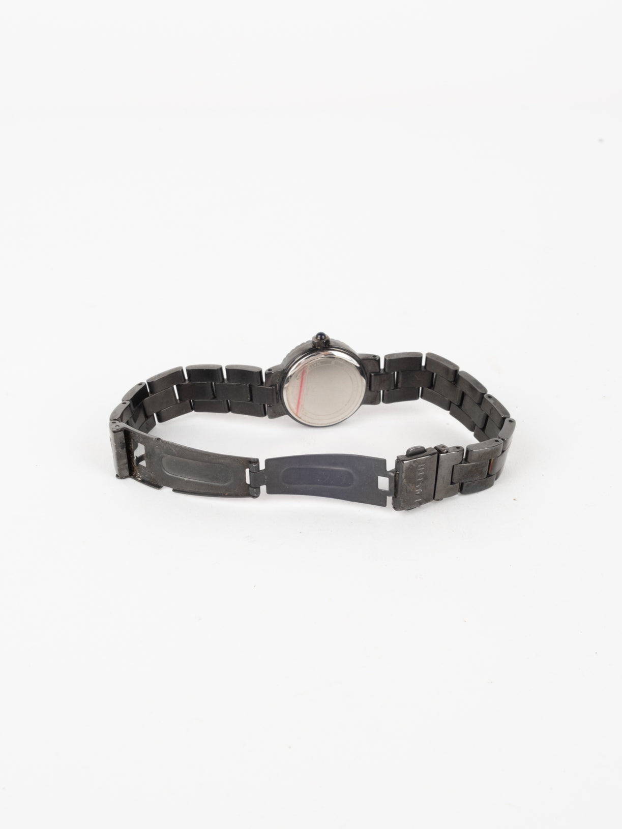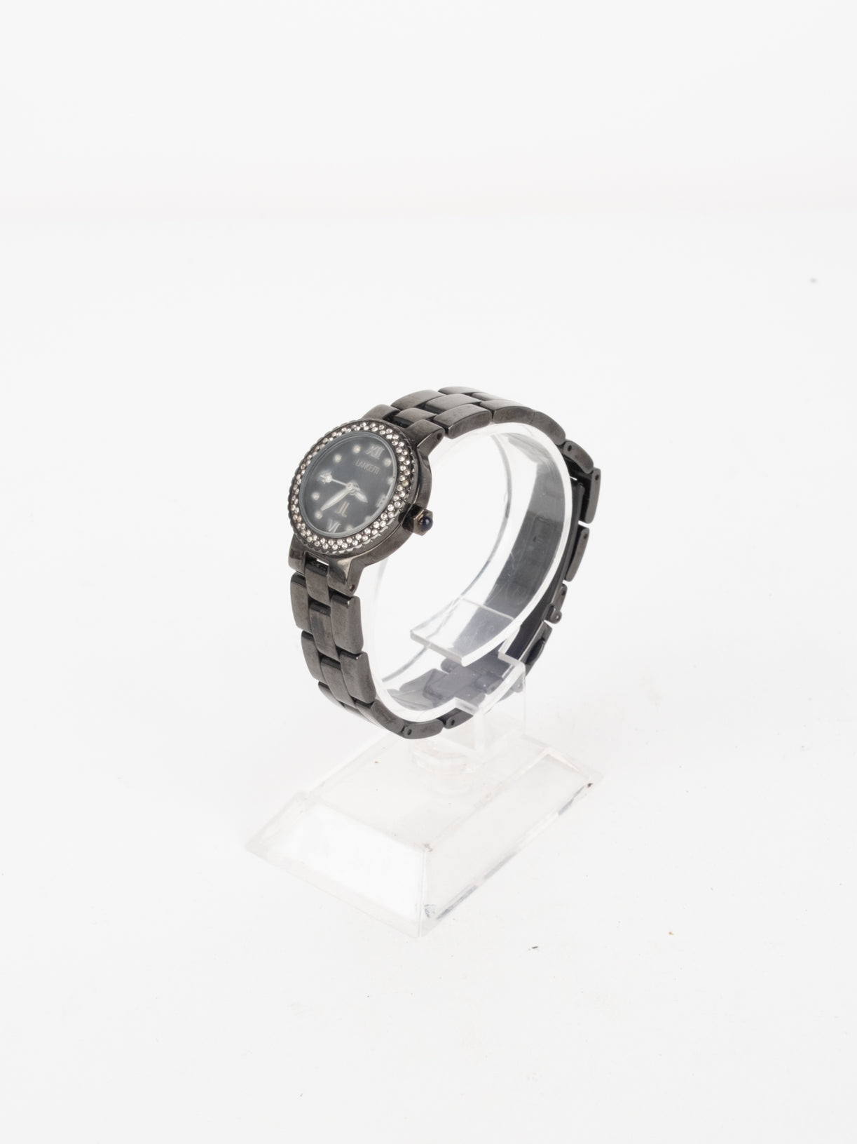 שעון מהמם בצבע שחור בעל פני שעון בצורה עגולה עם רקע בצבע זהה ומחוגים כאשר פני השעון מצופים בזריקונים לבנים קטנים. שעון זה נסגר באמצעות סוגר ממותג.