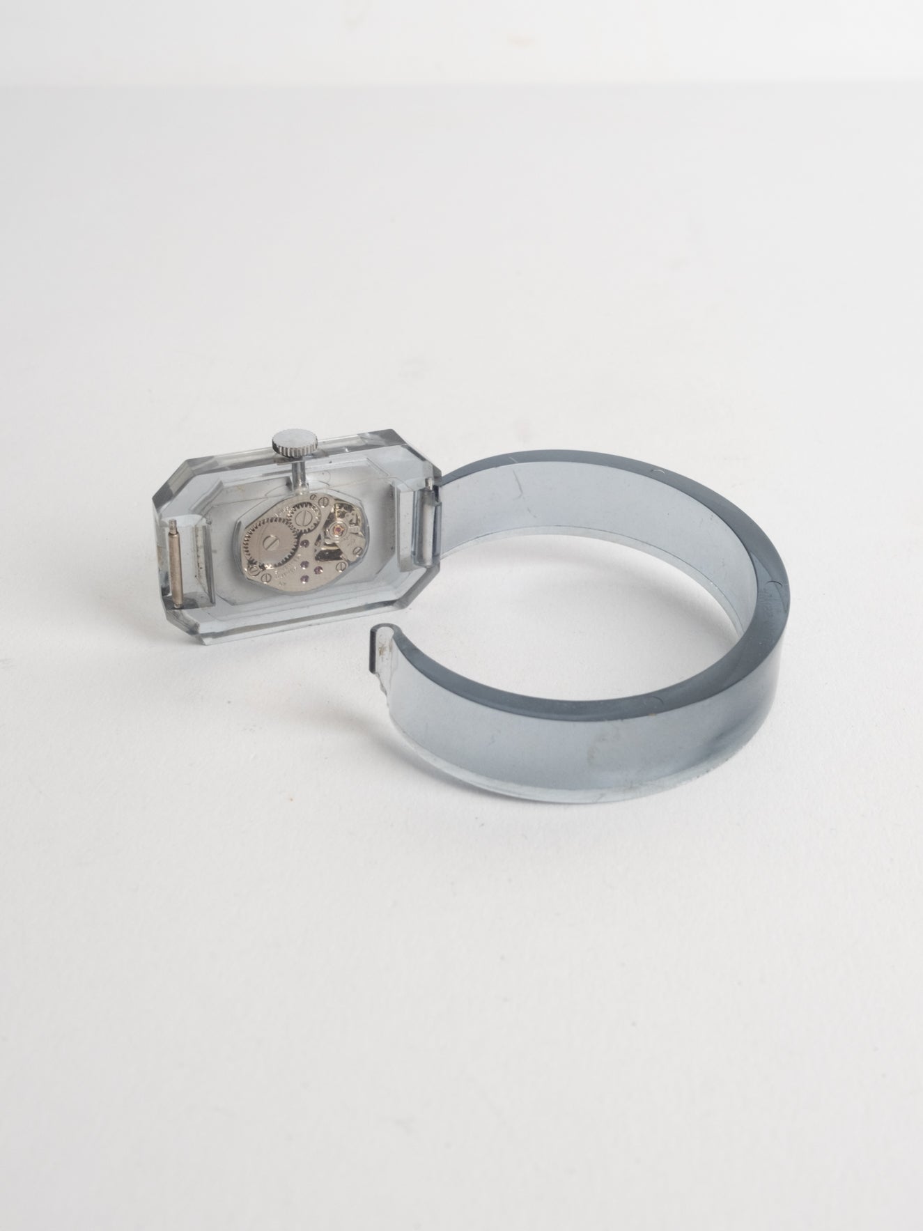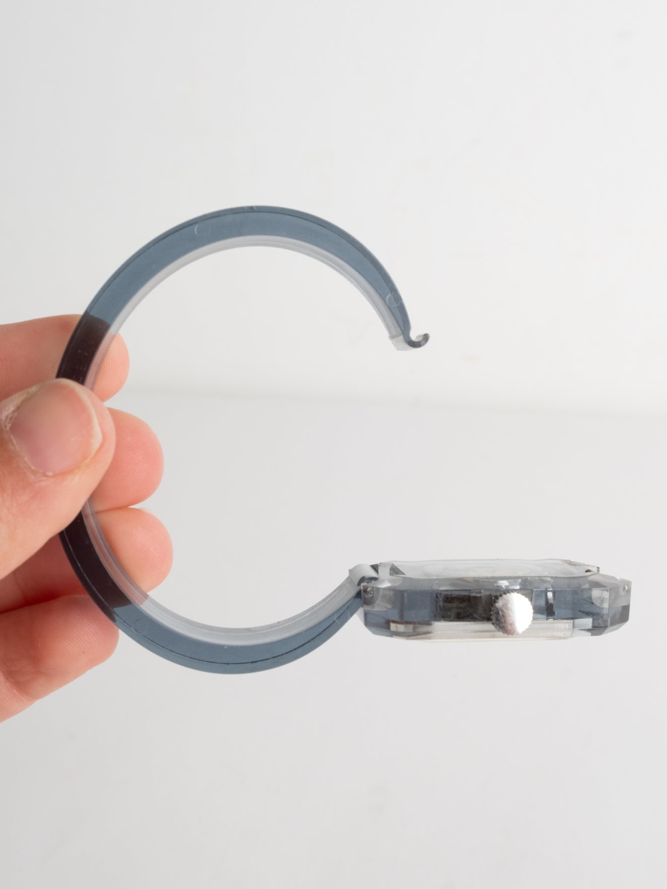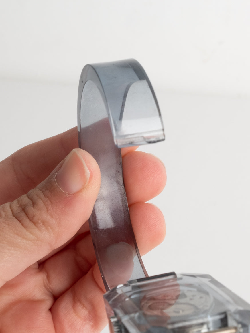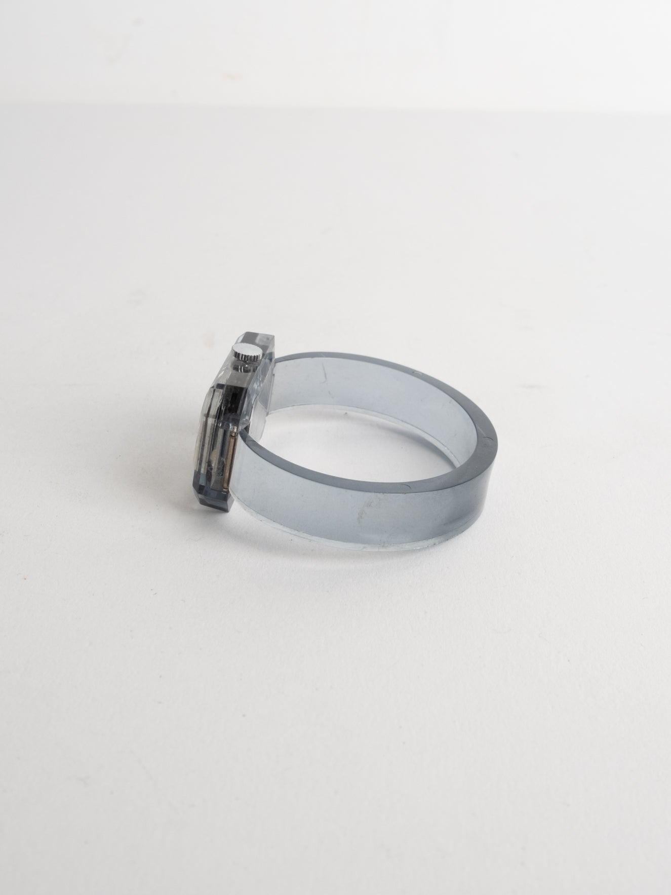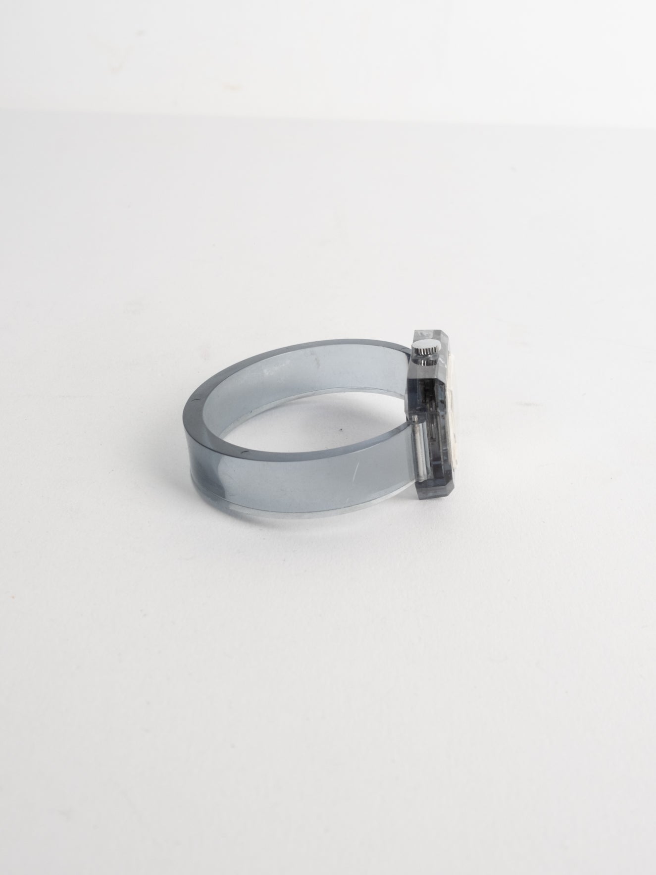 שעון שהוא למעשה צמיד בעל פני שעון בצורה מלבנית עם רקע לבן ומחוגים. שעון זה הוא למעשה צמיד שקוף ונפתח מצד אחד.