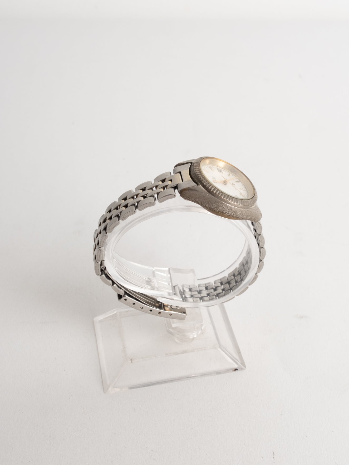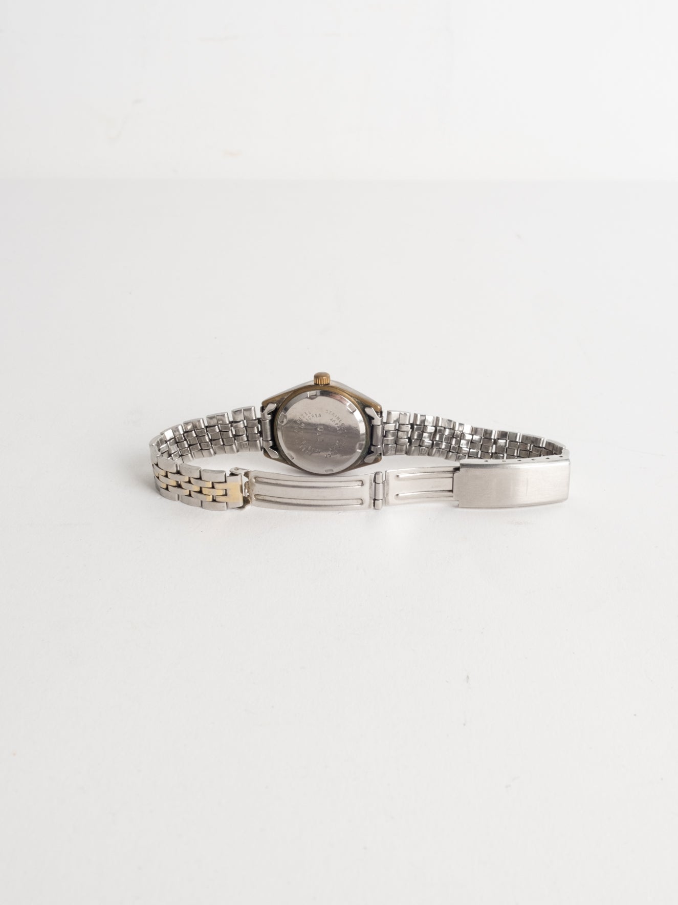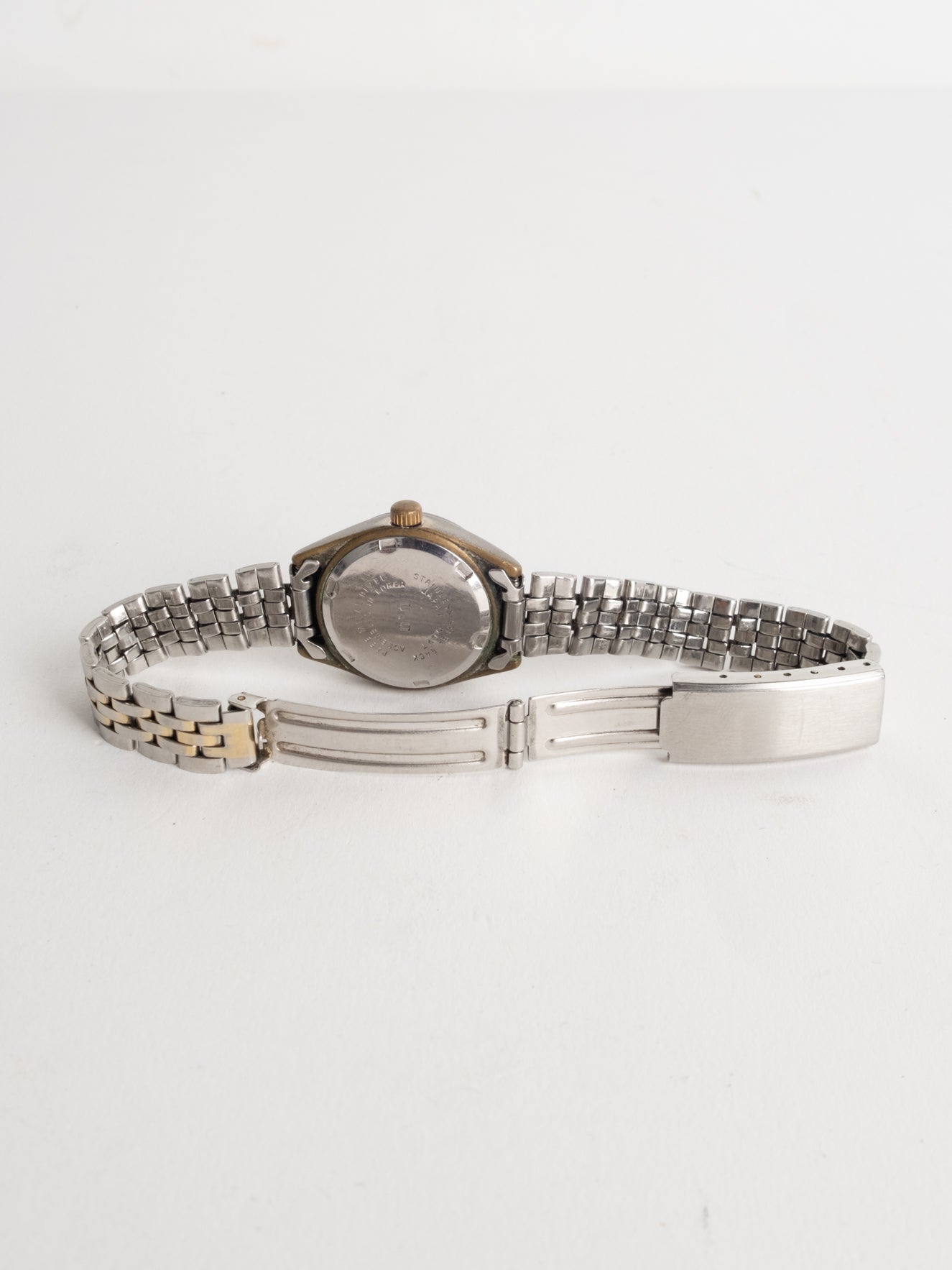 שעון קלאסי בצבע כסוף המשולב עם זהב בעל פני שעון בצורה עגולה עם רקע לבן ומחוגים. שעון זה נסגר באמצעות סוגר ממותג.
