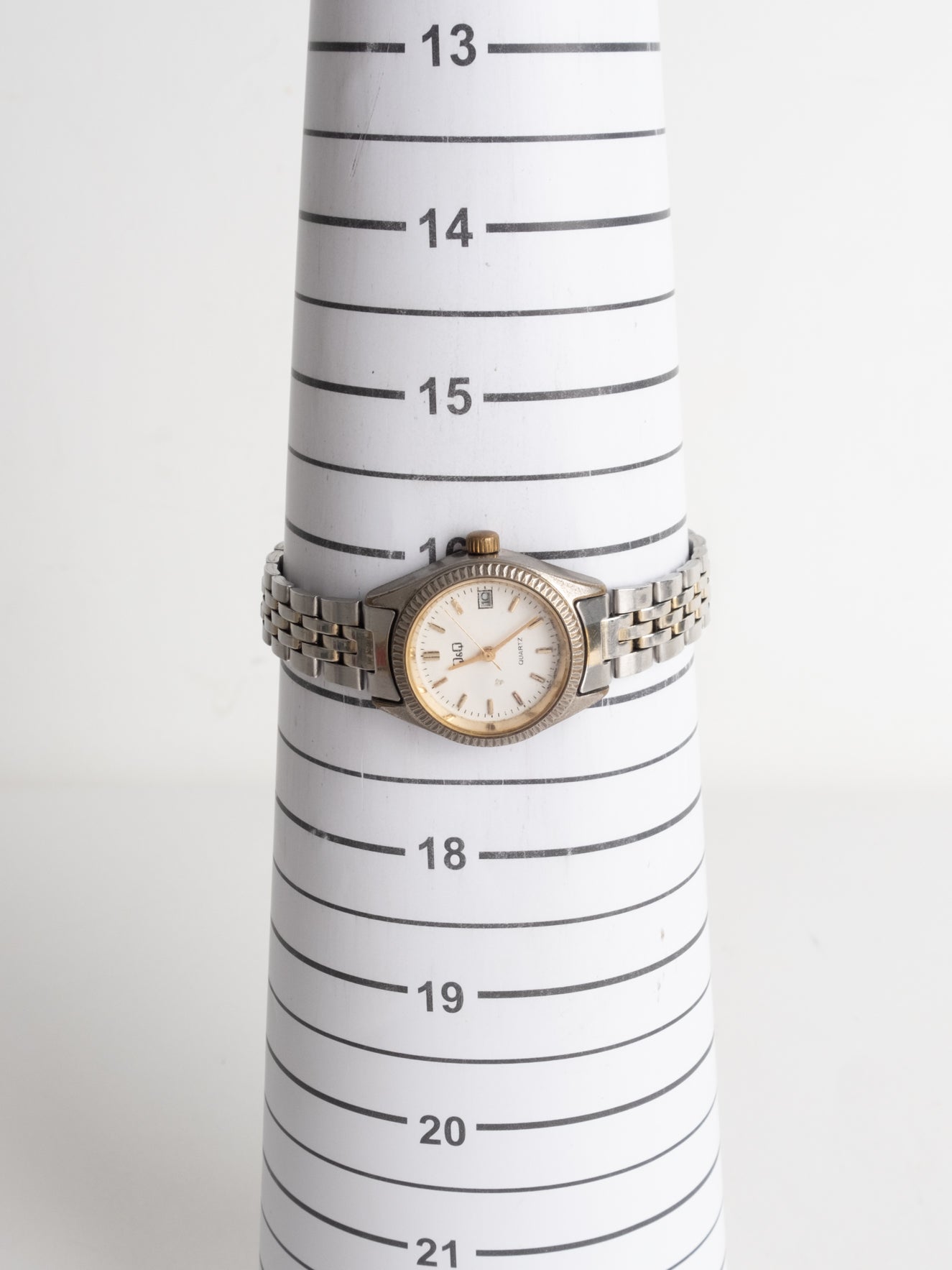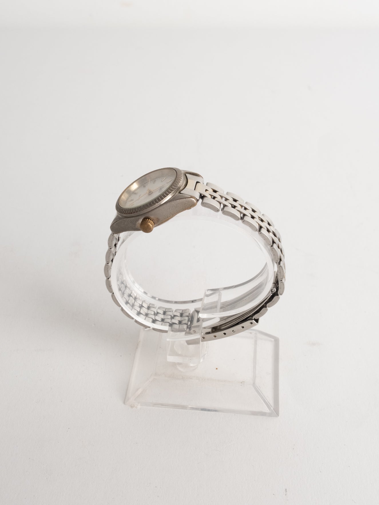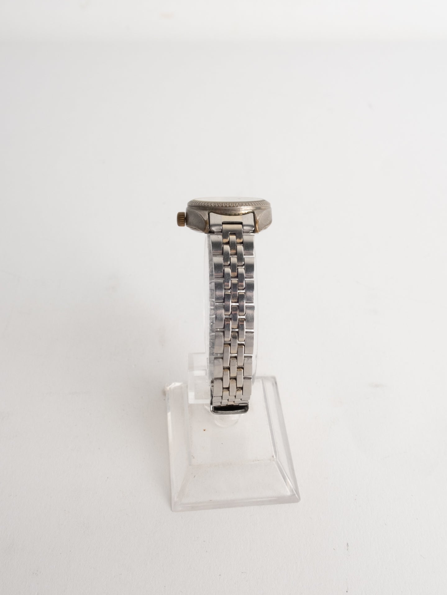 שעון קלאסי בצבע כסוף המשולב עם זהב בעל פני שעון בצורה עגולה עם רקע לבן ומחוגים. שעון זה נסגר באמצעות סוגר ממותג.