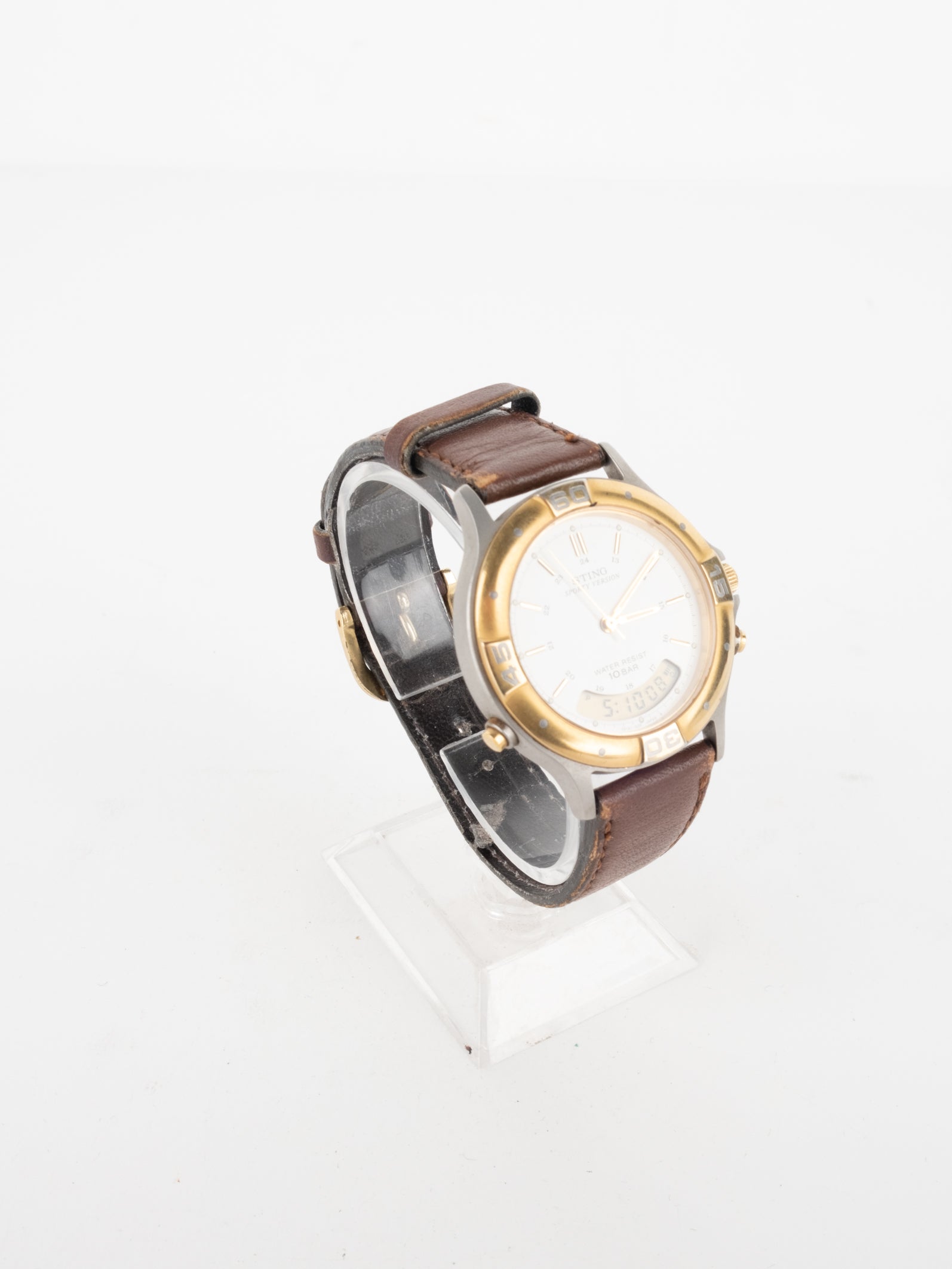 שעון מסיבי בסגנון ספורטיבי בעל פני שעון בצורה עגולה עם מסגרת מוזהבת המשולבת עם כסף, רקע לבן מחוגים ומספרים. שעון זה נסגר באמצעות רצועות העשויות מעור בצבע חום כהה שניתן לכוון.