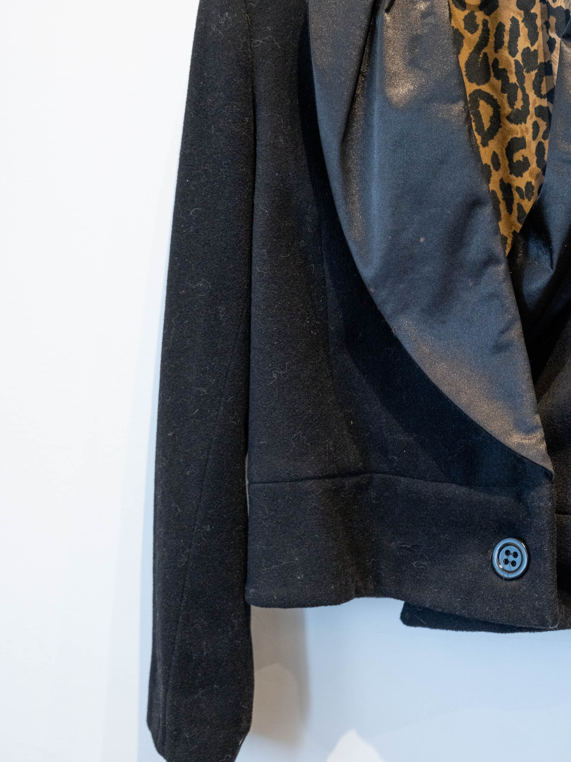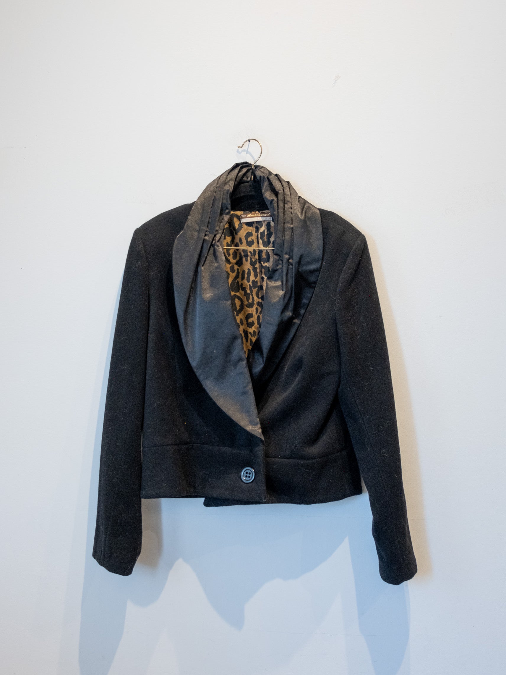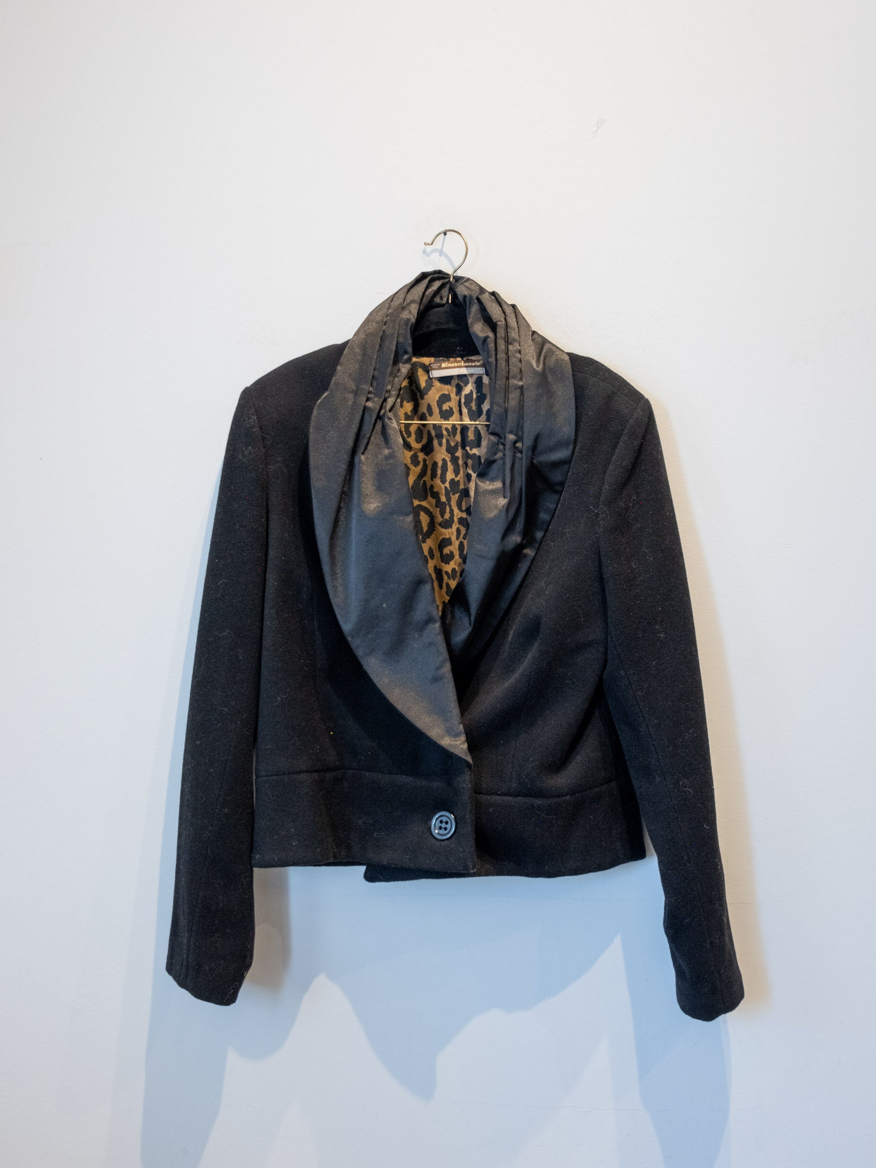 ג׳קט בצבע שחור בגזרה קצרה הנסגר באמצעות כפתור ללא כיסים, בעל דיטיילים מעניינים בצורת פס סטן בצווארון ובטנה מנומרת.