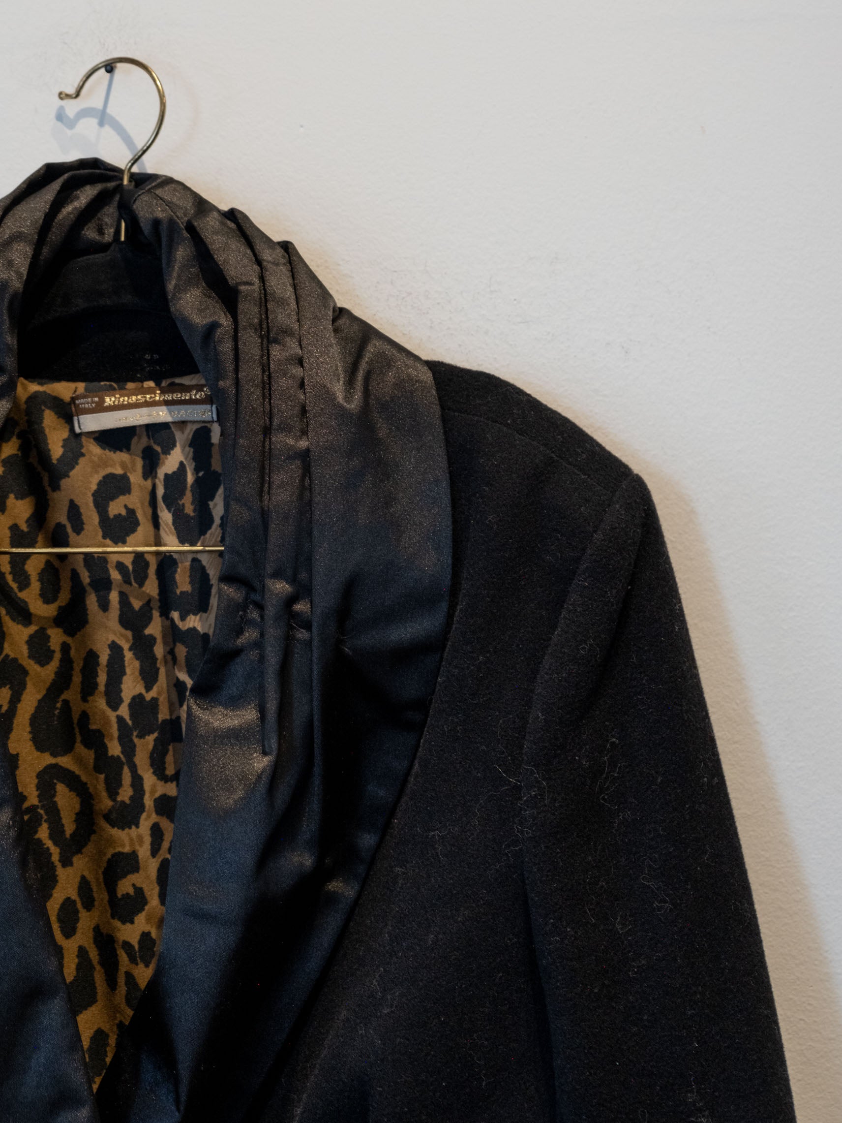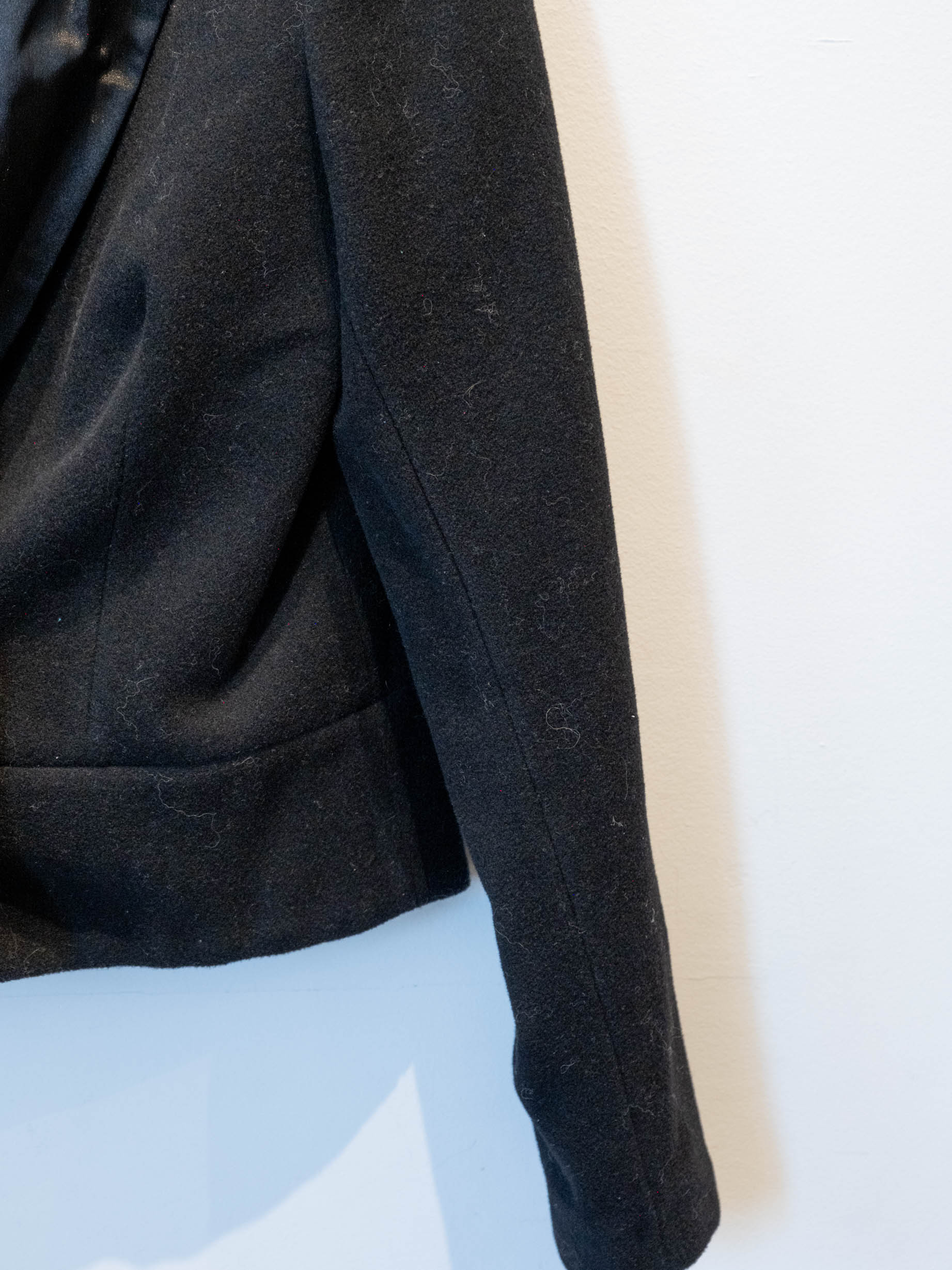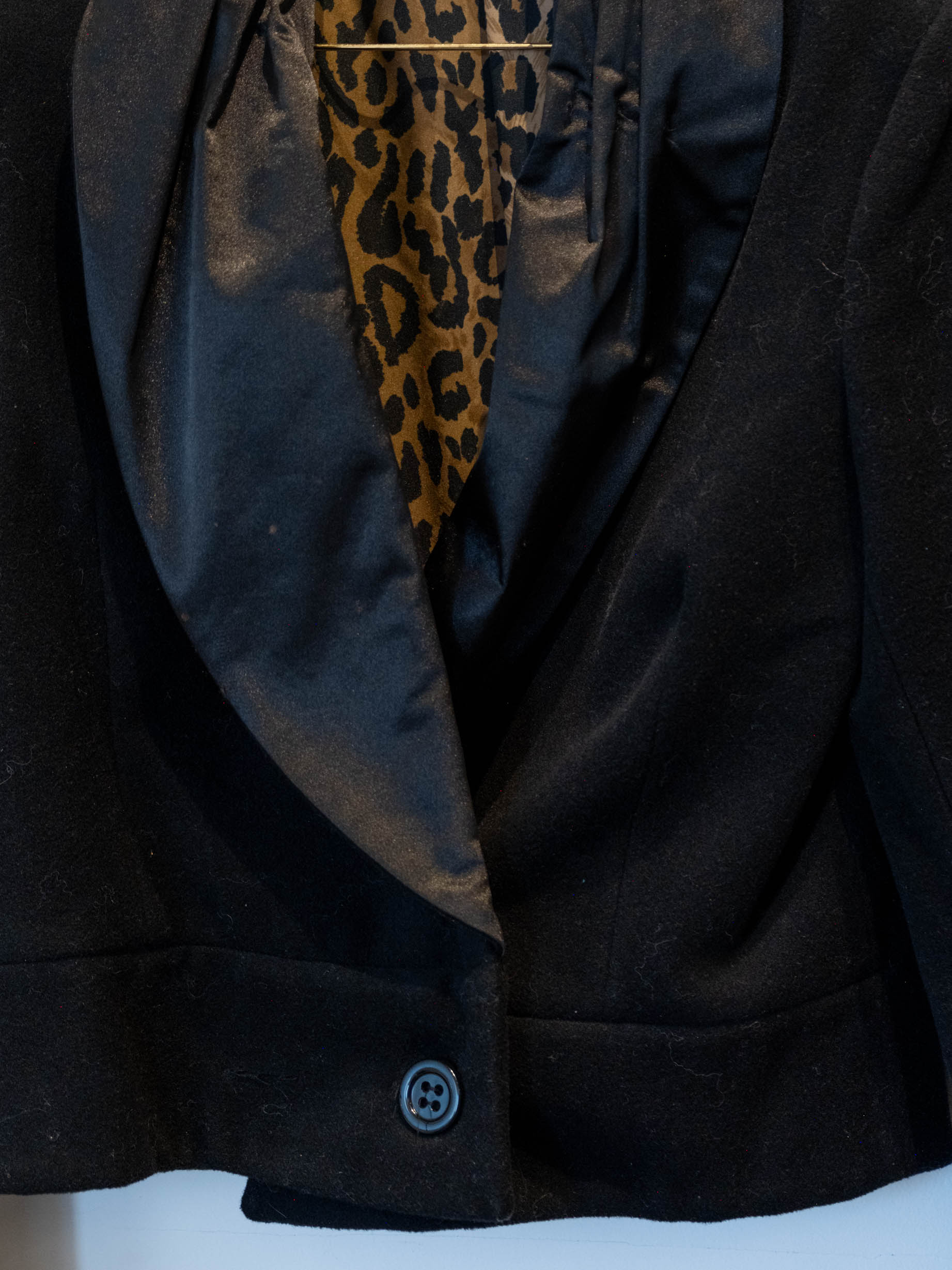 ג׳קט בצבע שחור בגזרה קצרה הנסגר באמצעות כפתור ללא כיסים, בעל דיטיילים מעניינים בצורת פס סטן בצווארון ובטנה מנומרת.